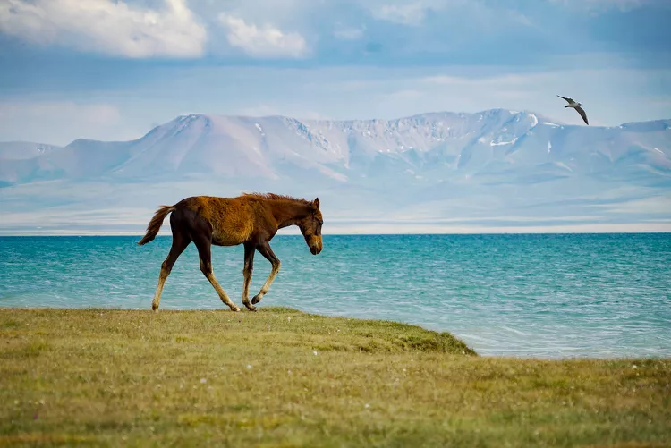 The alpine lake of Song Kul sits 9,895 feet high in the mountainous northern region of the Naryn Province in Kyrgyzstan. The 167-square-mile lake is the largest freshwater lake in Kyrgyzstan and is nestled between the Moldo Too mountains to the south and the Songkul Too ridge to the north. Song Kul and the grassy fields surrounding it are especially popular among travelers in the summertime. Visitors to the beautiful mountain lake enjoy swimming, hiking, camping, and horseback riding at the scenic alpine getaway.