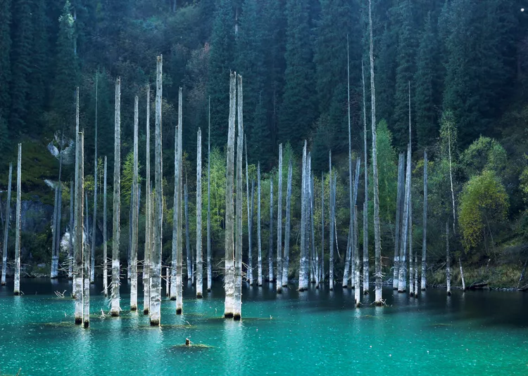 Situated within Kolsay Lakes National Park in southern Kazakhstan, Kaindy Lake was formed in 1911 when a limestone landslide dammed up a gorge and it was filled with water from a mountain river. The beautiful lake, which reaches 1,300 feet long and 98 feet deep, has a blueish-green hue due to the deposit of limestone in the water. Kaindy Lake is also notable for the Asian spruce trunks rising above its surface, giving it the nickname “sunken forest.”