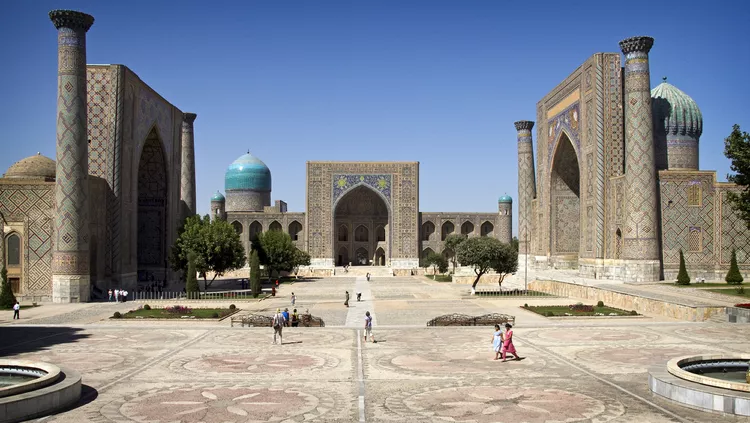 Registan, or “sandy place” in Persian, was the center of the ancient city of Samarkand in modern day Uzbekistan, and stands today as an impressive remnant of the Timurid Empire. The highlight of Registan Square are the three “madrassas,” Arabic for “schools,” that border the square. The first one built, Ulugh Beg Madrasa, was constructed from 1417 to 1420 by the grandson of the first Timurid ruler, Timur, and features a large, vaulted hall called an iwan, with two towering minarets on either side. The other two madrassas, Sher-Dor Madrasa and Tilya-Kori Madrasa, were built centuries later in the early and mid-17th century.